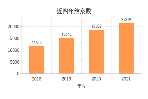 2021年,洛龙法院共受理各类案件23357件,同比增长18.75%;审结21319件,同比增长15.23%。