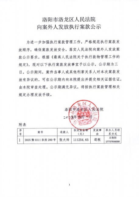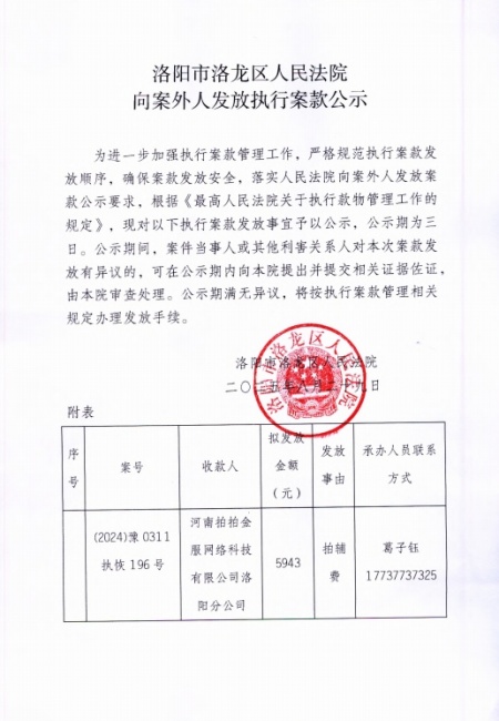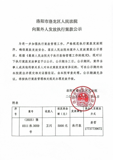 洛阳市洛龙区人民法院 向案外人发放执行案款公示