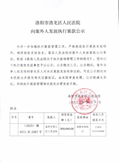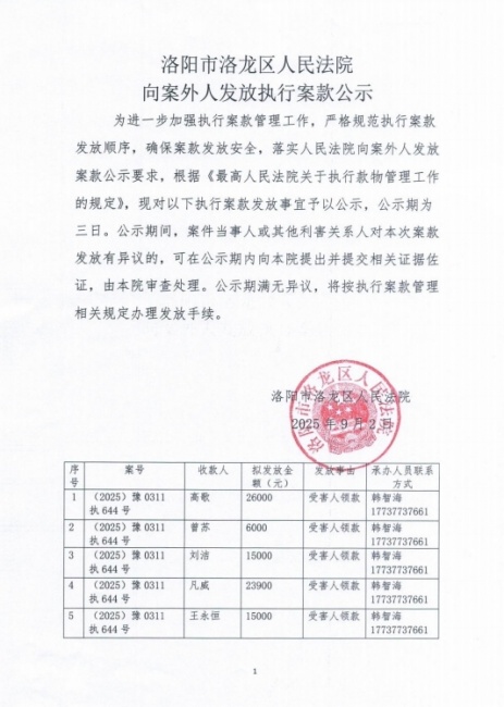 洛阳市洛龙区人民法院 向案外人发放执行案款公示