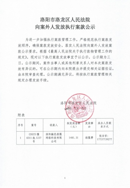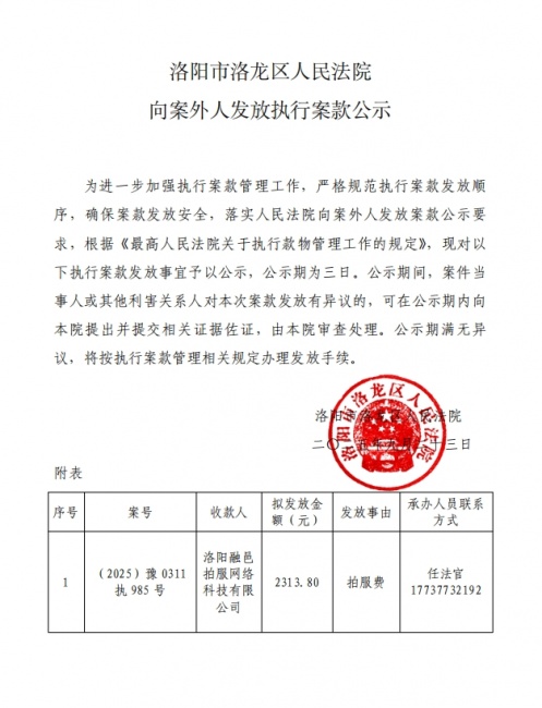 洛阳市洛龙区人民法院 向案外人发放执行案款公示