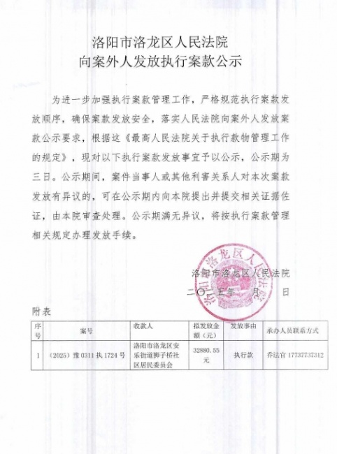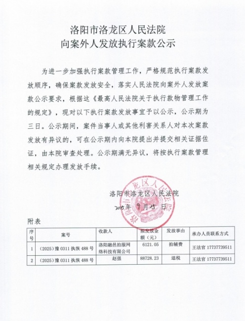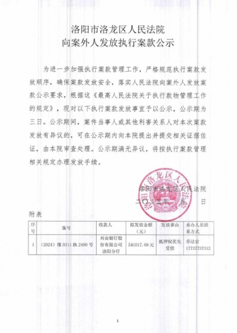 洛阳市洛龙区人民法院 向案外人发放执行案款公示