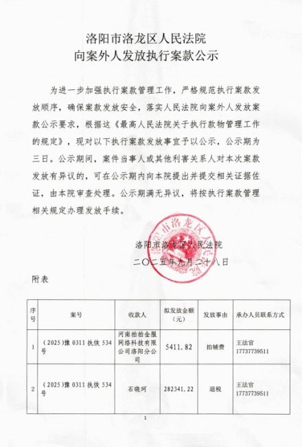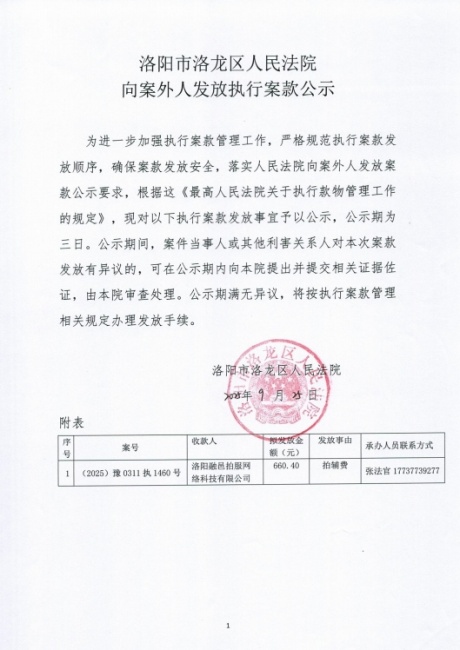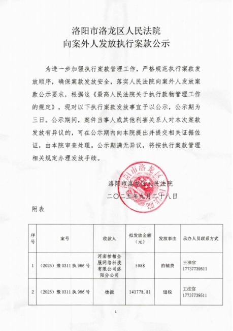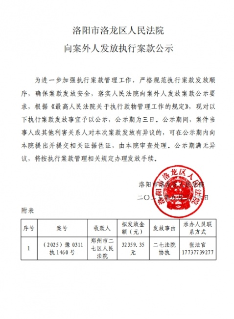 洛阳市洛龙区人民法院 向案外人发放执行案款公示