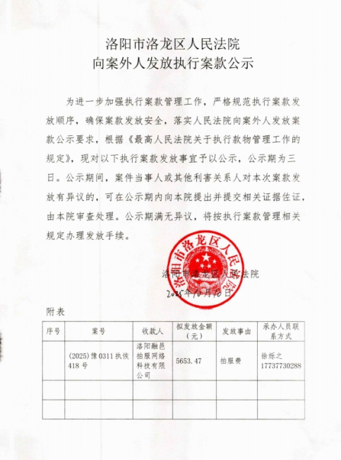 洛阳市洛龙区人民法院 向案外人发放执行案款公示