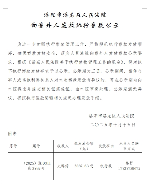 洛阳市洛龙区人民法院 向案外人发放执行案款公示