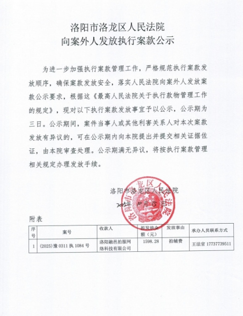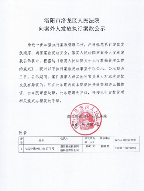 洛阳市洛龙区人民法院 向案外人发放执行案款公示