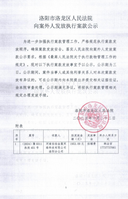 洛阳市洛龙区人民法院 向案外人发放执行案款公示