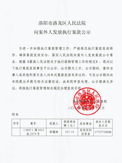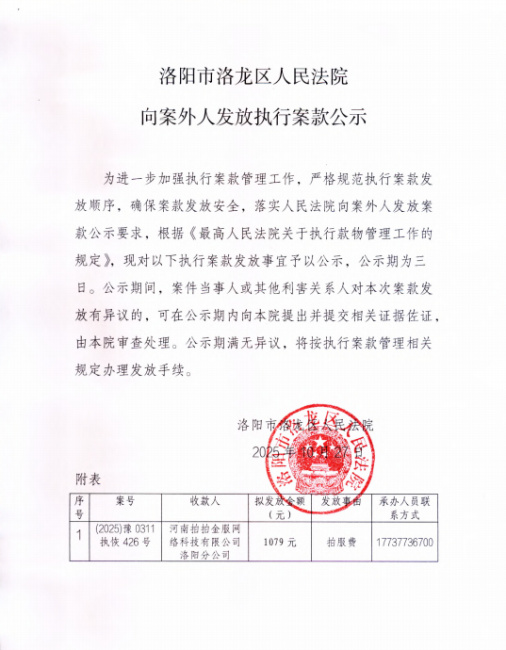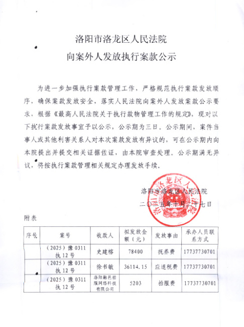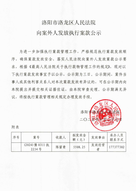 洛阳市洛龙区人民法院 向案外人发放执行案款公示