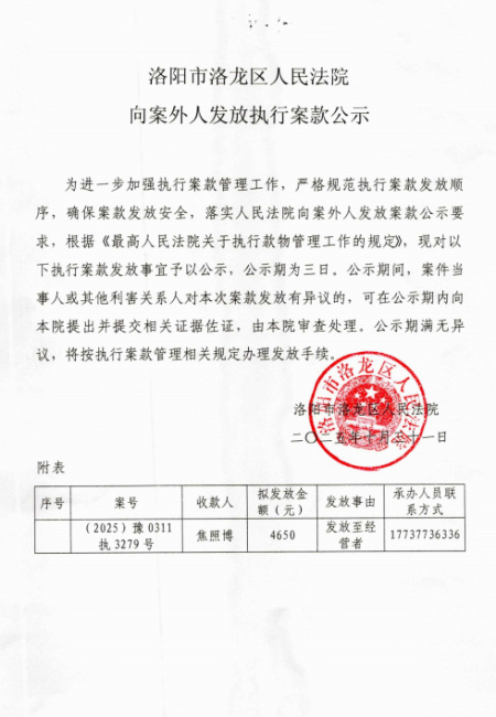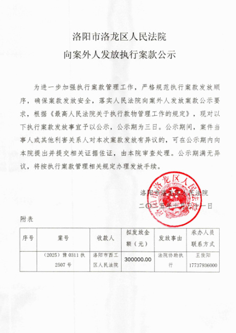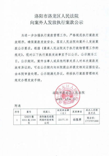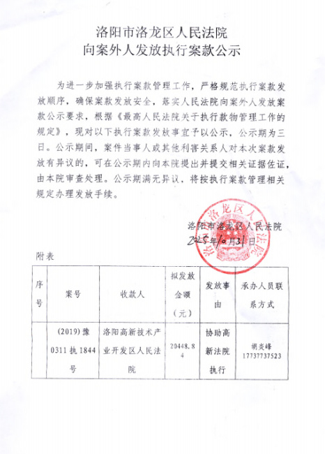 洛阳市洛龙区人民法院 向案外人发放执行案款公示