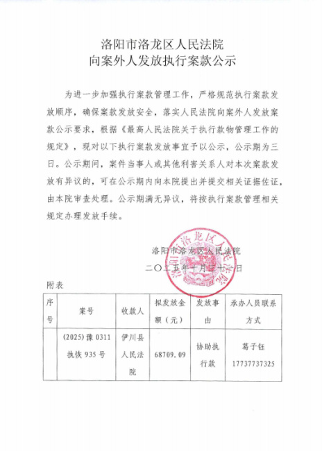 洛阳市洛龙区人民法院 向案外人发放执行案款公示