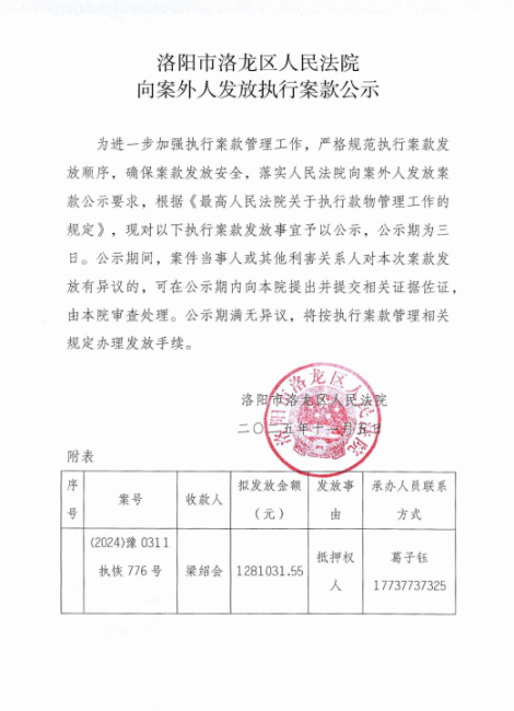 洛阳市洛龙区人民法院 向案外人发放执行案款公示