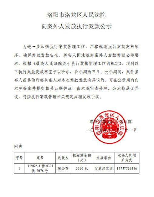 洛阳市洛龙区人民法院 向案外人发放执行案款公示