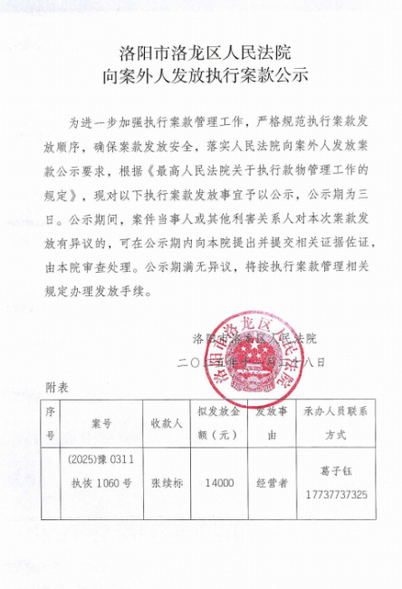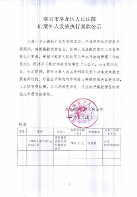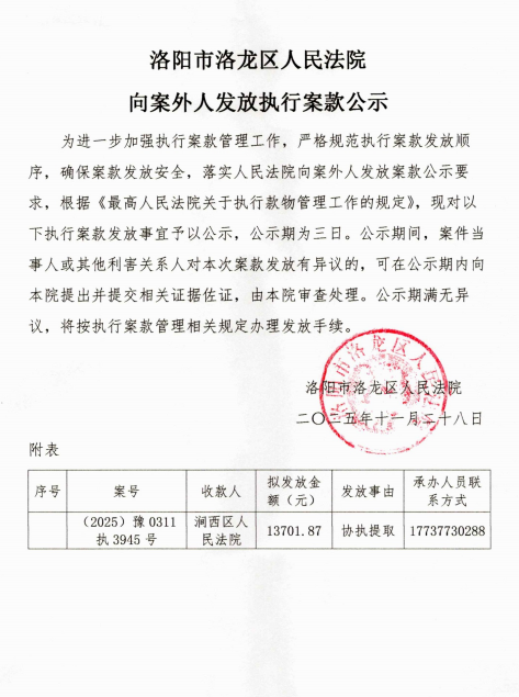 洛阳市洛龙区人民法院 向案外人发放执行案款公示