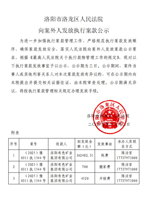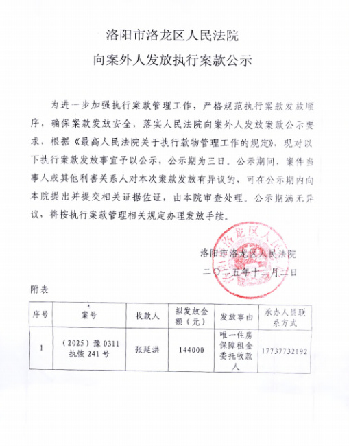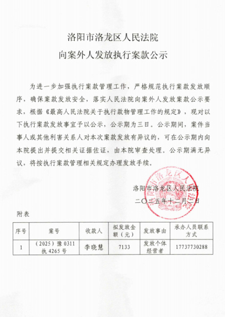 洛阳市洛龙区人民法院 向案外人发放执行案款公示