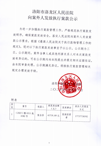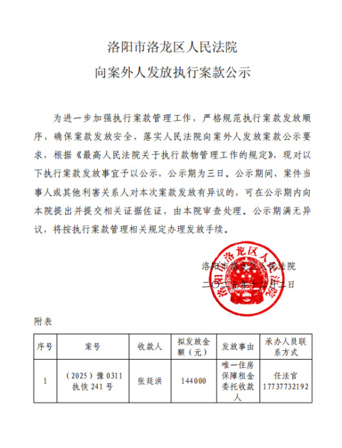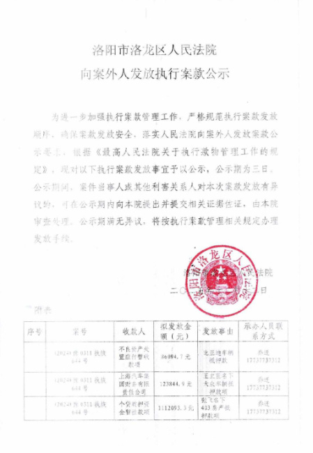 洛阳市洛龙区人民法院 向案外人发放执行案款公示