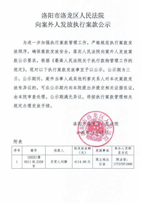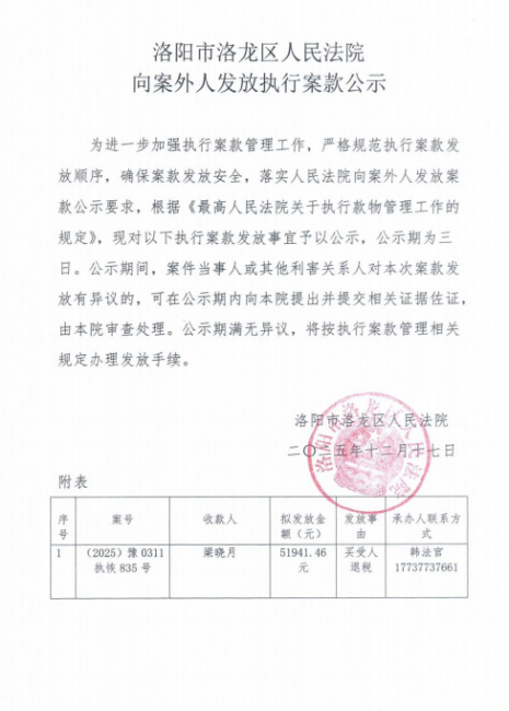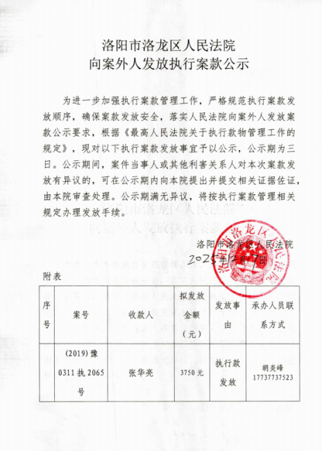 洛阳市洛龙区人民法院 向案外人发放执行案款公示