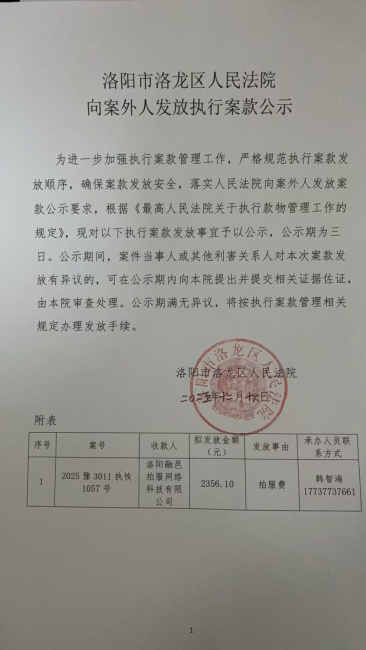 洛阳市洛龙区人民法院 向案外人发放执行案款公示