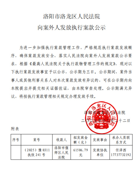 洛阳市洛龙区人民法院 向案外人发放执行案款公示