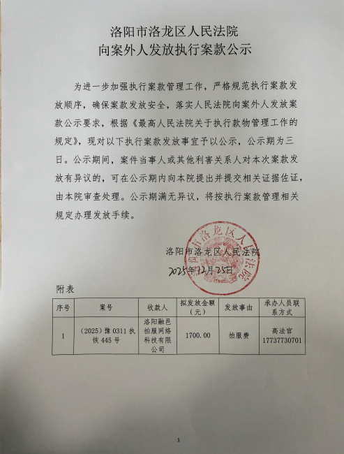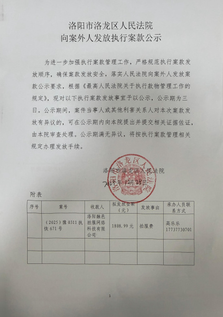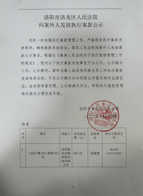 洛阳市洛龙区人民法院 向案外人发放执行案款公示