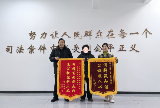 就在同一天,当事人白某手持另一面写有“调解促和谐 公正暖人心”的锦旗,亲自来到法庭,向人民调解员王乐莉和靳灵安表达由衷的感激。这是一起因遗产分割引发的家庭纠纷。在白某父母和兄弟相继去世后,姑侄二人作为法定继承人和代位继承人就遗留的房产和现金分割问题产生严重分歧,致使亲情疏离、矛盾升级诉至法院。调解员接到案件后,并未急于调解,而是首先与社区干部、其他亲属深入沟通,全面掌握家庭背景和矛盾根源。随后,他们采取逐个沟通、多轮劝解的方式,从法律、人情、家庭和睦等多个角度耐心疏导。最终,在调解员的不懈努力下,这起涉及三代人的家庭矛盾得以圆满化解。调解工作并未就此止步,在协议达成后,调解员还主动协助当事人与社区对接,顺利完成了房产过户手续,真正做到了“案结事了人和”。