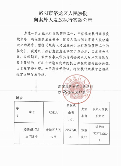 洛阳市洛龙区人民法院 向案外人发放执行案款公示