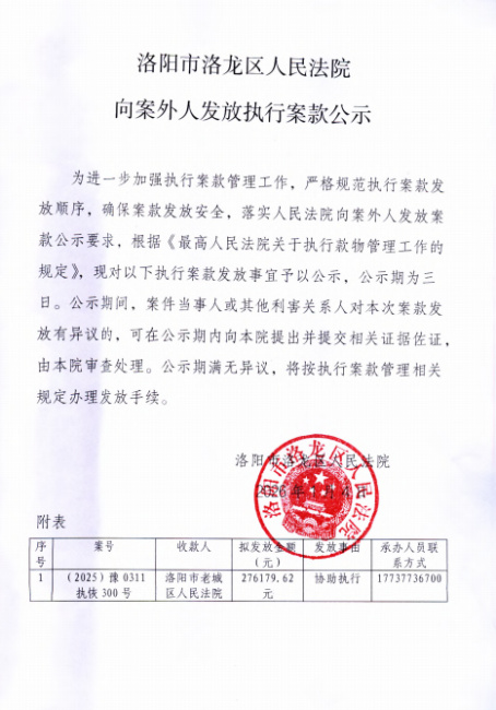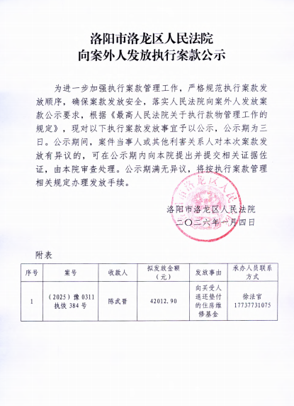 洛阳市洛龙区人民法院 向案外人发放执行案款公示