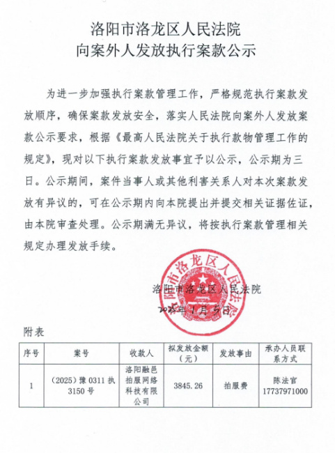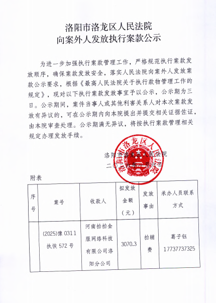 洛阳市洛龙区人民法院 向案外人发放执行案款公示