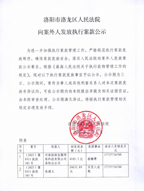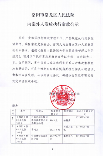 洛阳市洛龙区人民法院 向案外人发放执行案款公示