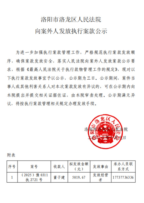 洛阳市洛龙区人民法院 向案外人发放执行案款公示