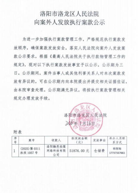 洛阳市洛龙区人民法院 向案外人发放执行案款公示