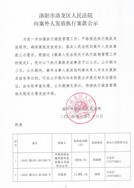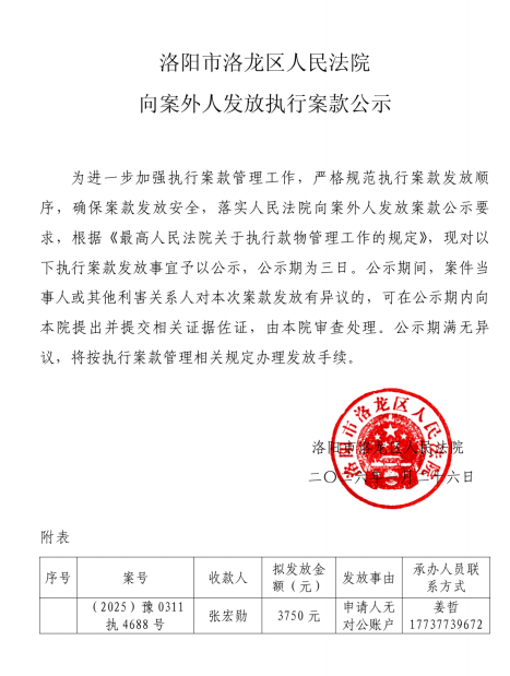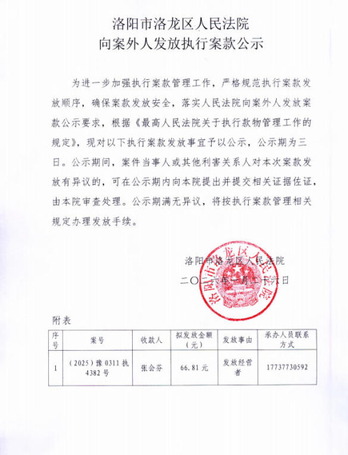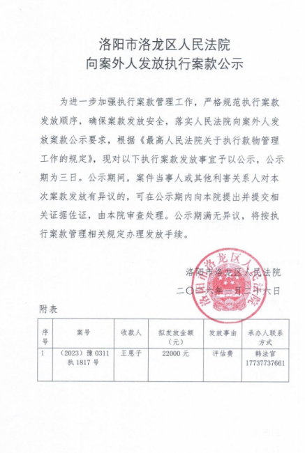 洛阳市洛龙区人民法院 向案外人发放执行案款公示