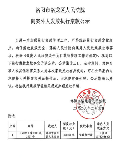 洛阳市洛龙区人民法院 向案外人发放执行案款公示