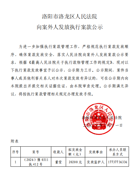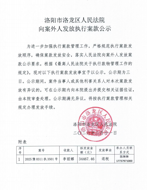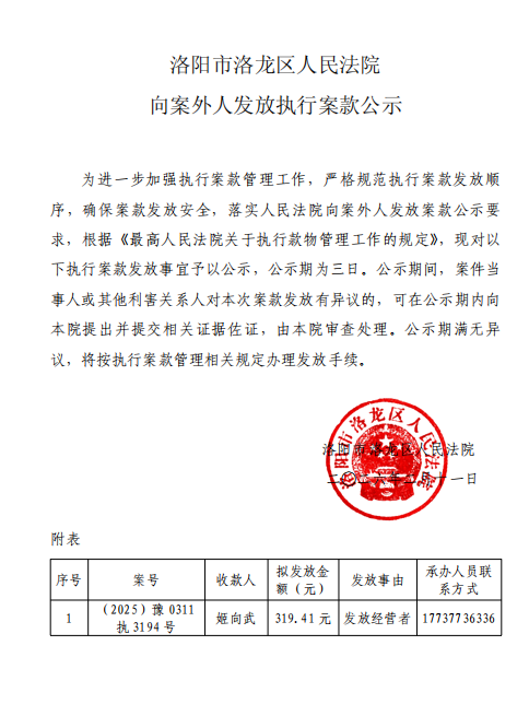 洛阳市洛龙区人民法院 向案外人发放执行案款公示