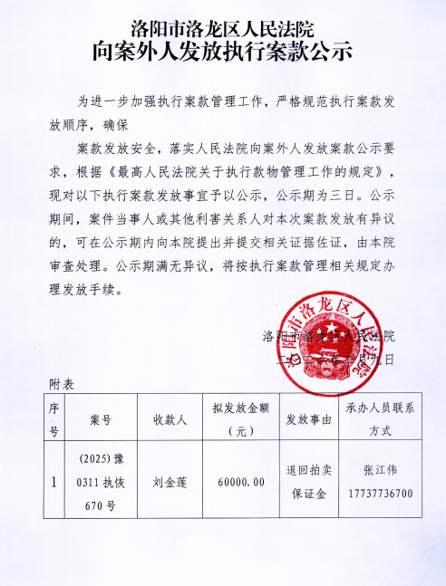 洛阳市洛龙区人民法院 向案外人发放执行案款公示
