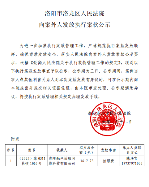 洛阳市洛龙区人民法院 向案外人发放执行案款公示