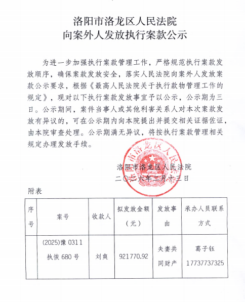 洛阳市洛龙区人民法院 向案外人发放执行案款公示