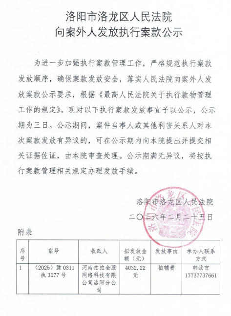 洛阳市洛龙区人民法院 向案外人发放执行案款公示