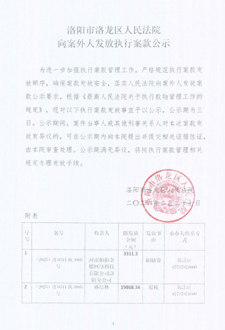 洛阳市洛龙区人民法院 向案外人发放执行案款公示