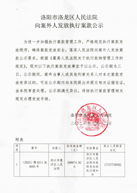 洛阳市洛龙区人民法院 向案外人发放执行案款公示