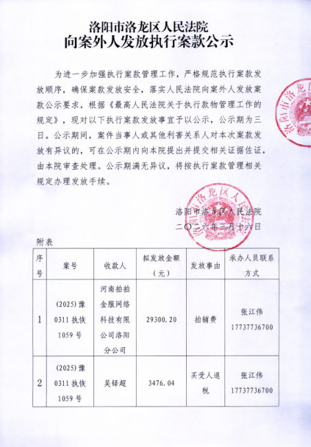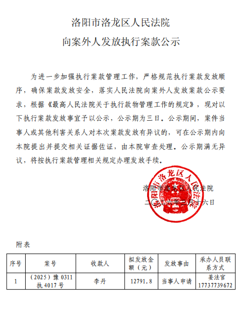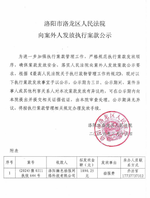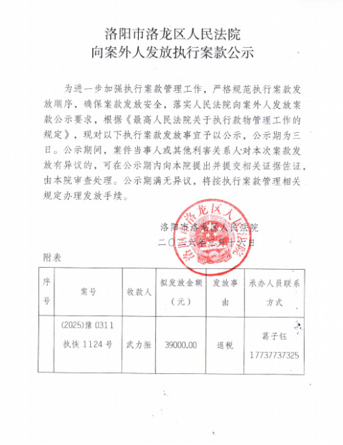 洛阳市洛龙区人民法院 向案外人发放执行案款公示