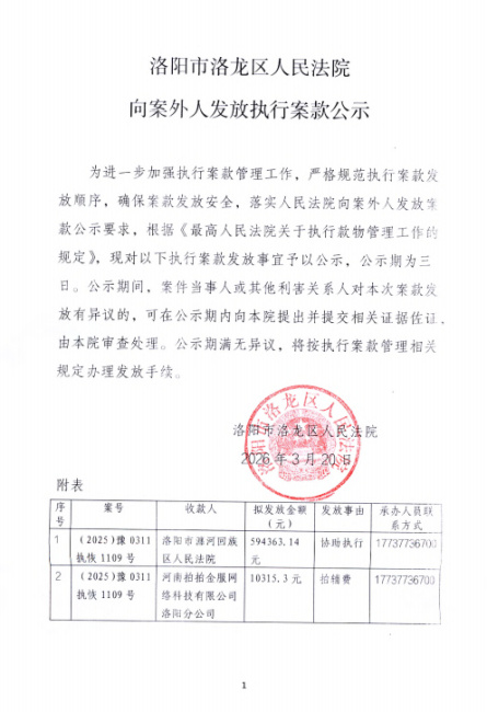 洛阳市洛龙区人民法院 向案外人发放执行案款公示